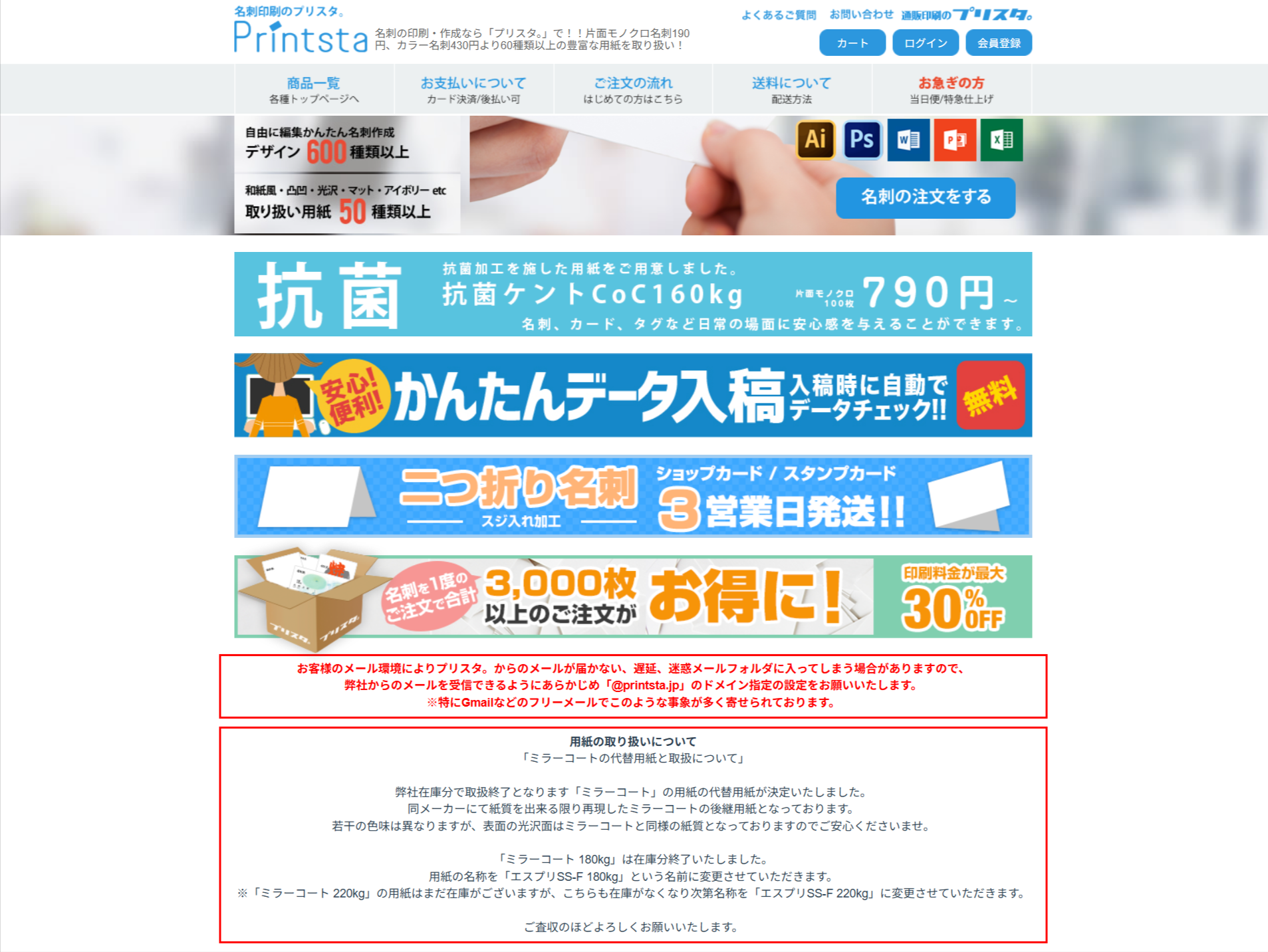 【PR】プリスタ。 今回ご紹介するのは、名刺作成を主に行っているサイトになります!★4つのおすすめポイント★1.名刺印刷が100枚190円〜にて印刷可能 2.最短当日発送3.大阪市内であれば当日中のお届けも可能 4.豊富な用紙で高品質こちらのサイトでは、名刺はもちろんハガキ、ポストカード、チラシ等も作成可能になっております。仕事やイベントでの利用や、年賀状等の行事ごとにも役立ちますね♪指定時間の注文で、当日出荷もしてくれるので、お急ぎの方もお気軽に頼めちゃいます!詳しくは「詳細はこちらをクリック」、または下記バナーをクリックしてくださいね! 詳細はこちらをクリック 商材名 プリスタ運営者 KS※当サイトはアフィリエイトプログラムを利用し宣伝目的で作成しております。